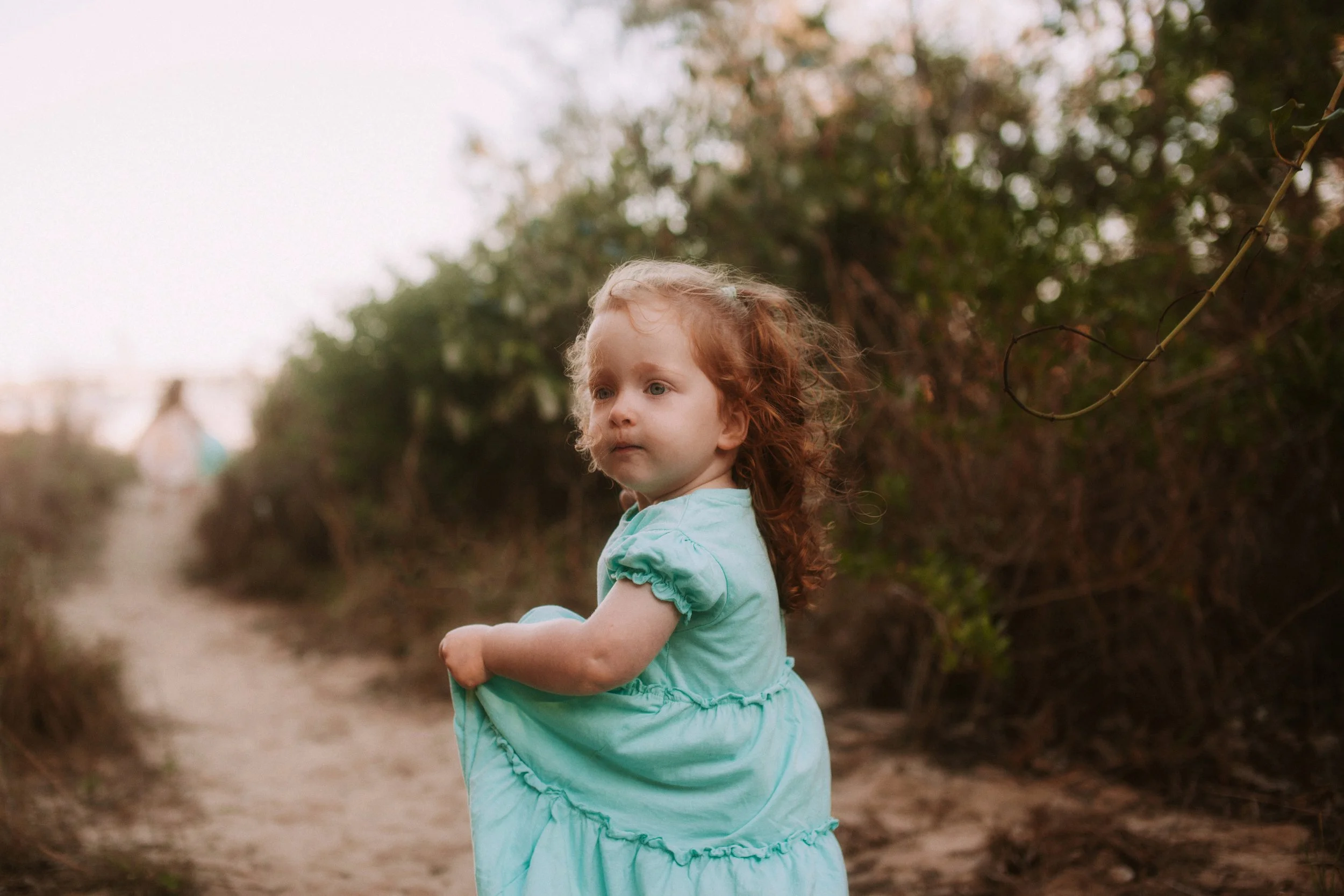 Two young red-haired girls exploring a grassy outdoor area with tall grass and rocky cliffs in the background